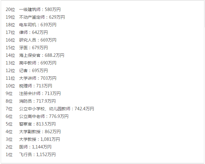 日本本國(guó)人高收入的職業(yè)和平均年薪