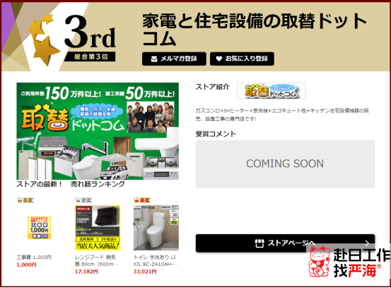 主營產品是燃氣灶,IH加熱器,洗碗機等家用電器?!炯译姢茸≌O備の取替ドットコム】在雅虎排行榜中也已蟬聯4年,服務超過150萬戶家庭。店鋪所販賣的產品不僅是產品本身,還包括安裝、維修等。產品免費質保3年,并且24小時對應緊急電話,用戶體驗感非常不錯,好評連連。
