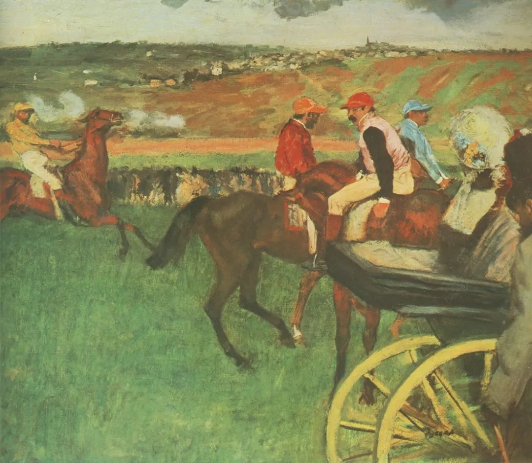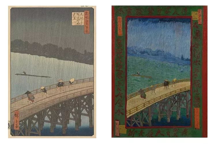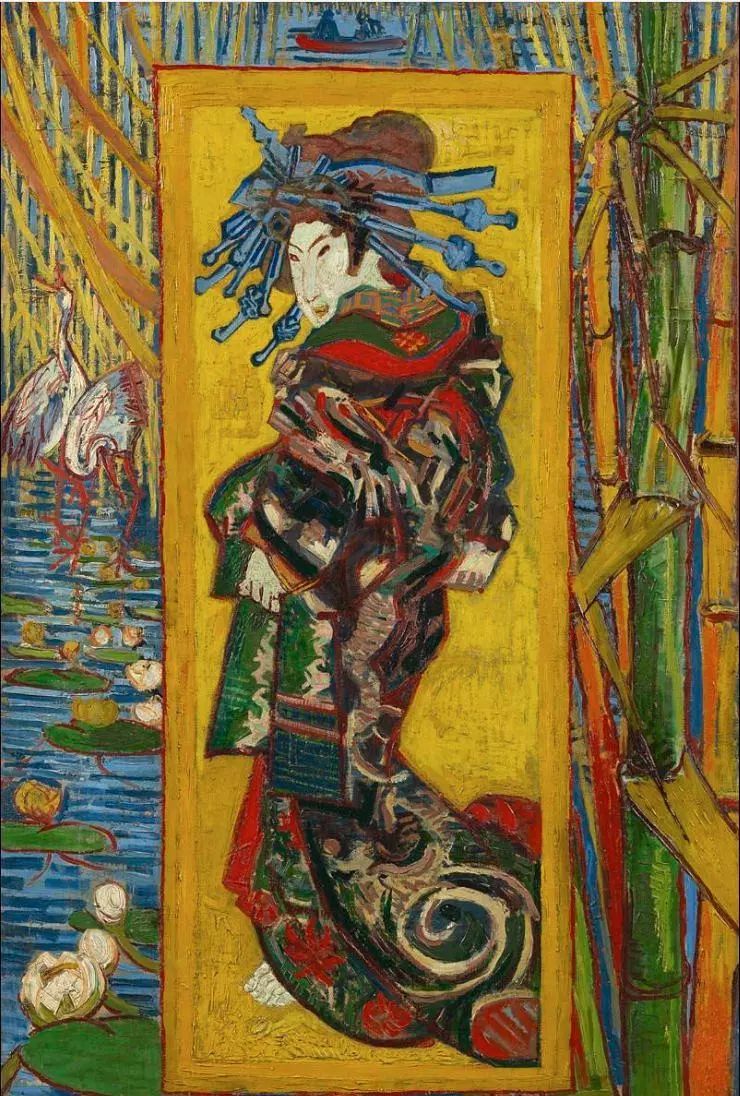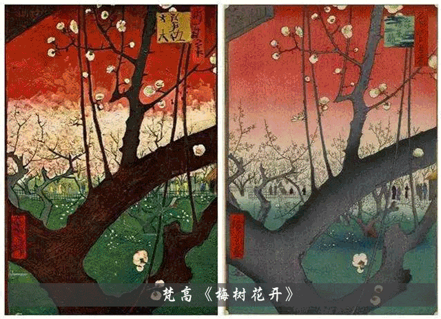 莫奈以妻子為模特的作品當(dāng)然,歐洲人是單純被畫(huà)面吸引,因此誕生出不少東西合璧的作品。浮世繪因?yàn)槭芟抻跈C(jī)器和材料,超大幅版畫(huà)需要拼接完成。這樣歐洲人就看到不少不完整的畫(huà)面,殘缺的構(gòu)圖反而被一些印象派、后印象派畫(huà)家當(dāng)做你沒(méi)見(jiàn)過(guò)的“全新構(gòu)圖方式”進(jìn)行創(chuàng)作。德加《賽馬會(huì)上》 1877—1880年 奧賽博物館藏再比如狂熱的浮世繪愛(ài)好者梵高,拿油畫(huà)顏料臨摹了歌川廣重的《龜戶梅屋》,然后他恭恭敬敬地把邊上的日文也寫上了,估計(jì)他完全沒(méi)意識(shí)到這其實(shí)是一張廣告,左右的日文是名字和地址——臨摹了一張煙花柳巷的傳單。梵高《開(kāi)花的梅樹(shù)》(右)上日文為 龜戶梅屋,吉原區(qū)一家花花酒館的宣傳
