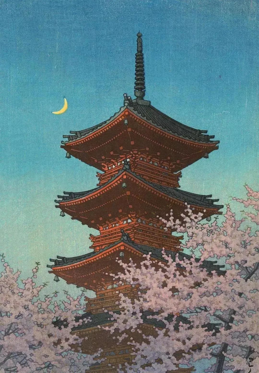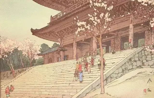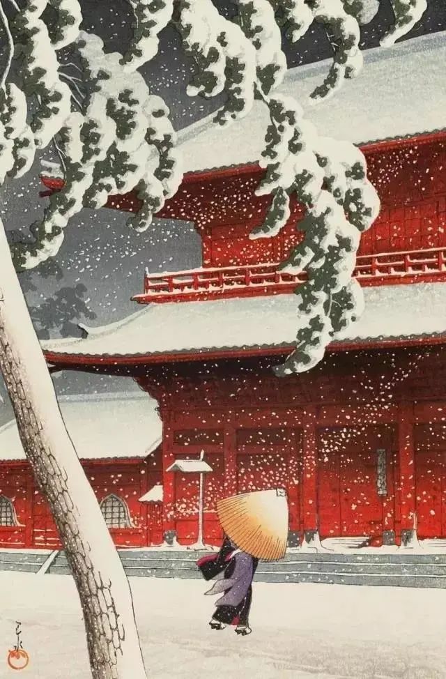 《佐佐寺的雪》—川瀬巴水明治維新后,大量西洋畫(huà)涌入日本,在全盤歐化的風(fēng)氣下,日本畫(huà)家開(kāi)始學(xué)習(xí)西方繪畫(huà),屬于江戶時(shí)代的浮世繪就此沒(méi)落。但它的奇妙旅程還在繼續(xù),20世紀(jì)初,不少畫(huà)家以浮世繪的材料與技法,創(chuàng)造出融合西方風(fēng)格的新浮世繪,這些作品被稱為“新版畫(huà)運(yùn)動(dòng)”,是帶著印象派光影和透視的浮世繪,代表人物有川瀬巴水和吉田博。