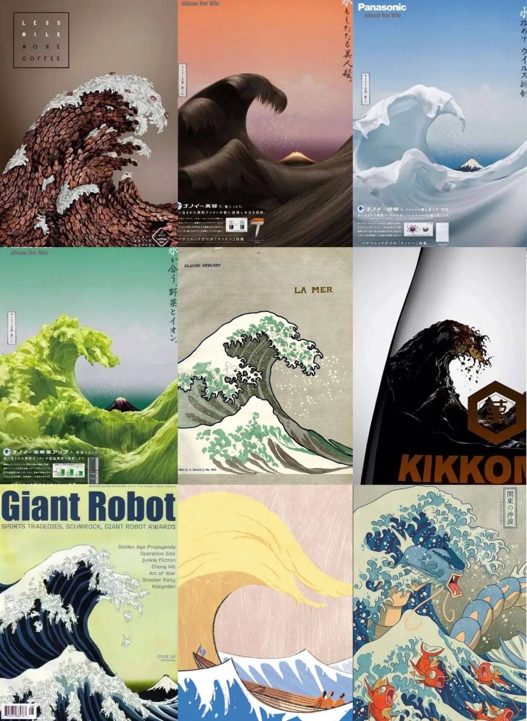 再放眼世界范圍,對(duì)這張畫(huà)的魔改可以用“無(wú)數(shù)”來(lái)形容。從咖啡豆到牛奶、生菜,甚至是神奇寶貝和川普的頭發(fā)都能化身《神奈川沖浪里》。