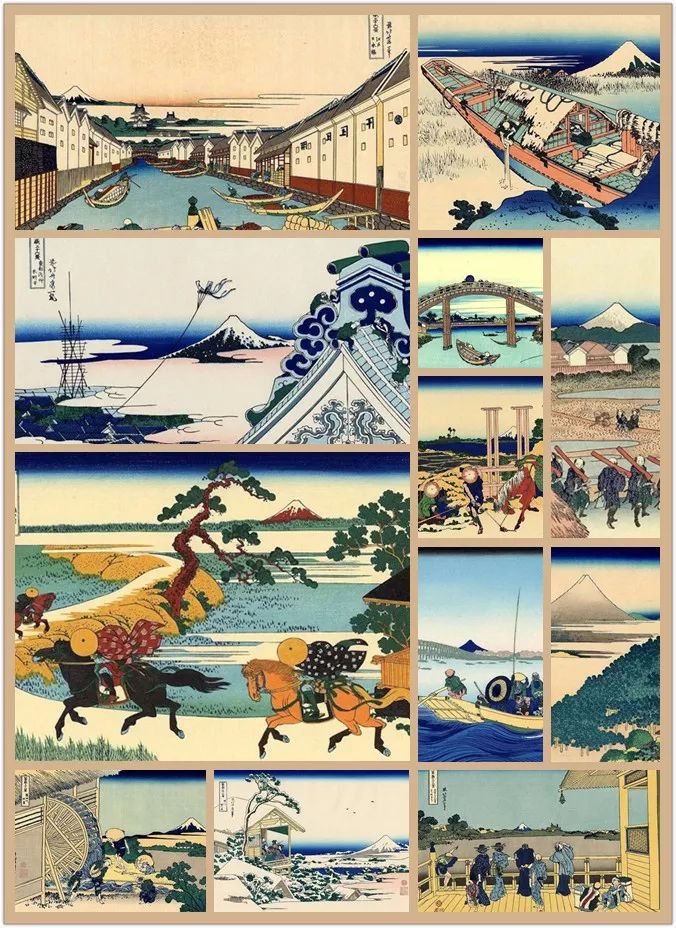 實(shí)際上,《神奈川沖浪里》這張畫(huà),只是《富岳三十六景》中的一張。《富岳三十六景》這批畫(huà)當(dāng)年足足印了有至少8000張,每張定價(jià)為16文、平民百姓兩碗面的價(jià)格,跟我們路邊小傳單、隨手貼墻上的海報(bào)一樣平凡。畫(huà)家葛飾北齋創(chuàng)作這批畫(huà),也純粹是為了賺錢謀生。這位窮了一輩子的大師,想用日本對(duì)富士山的崇拜追個(gè)熱點(diǎn),所以在這一系列的每張畫(huà)里,你都能看到一個(gè)或大或小的富士山。