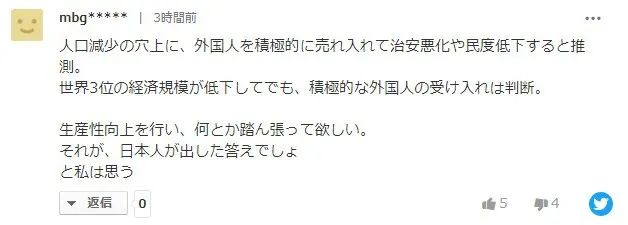 “日本人口在減少,還積極引入外國人,社會治安都變差了。這就是日本降為世界第三經濟大國的原因吧。”