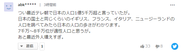 “最近,朝日新聞報道日本人口超過了1億5千萬,與日本國土面積差不多的意大利、法國、新西蘭等國家,人口只有差不多7~8千萬,日本如果也是這樣就剛好了。還有,最近外國人增加太多了……”