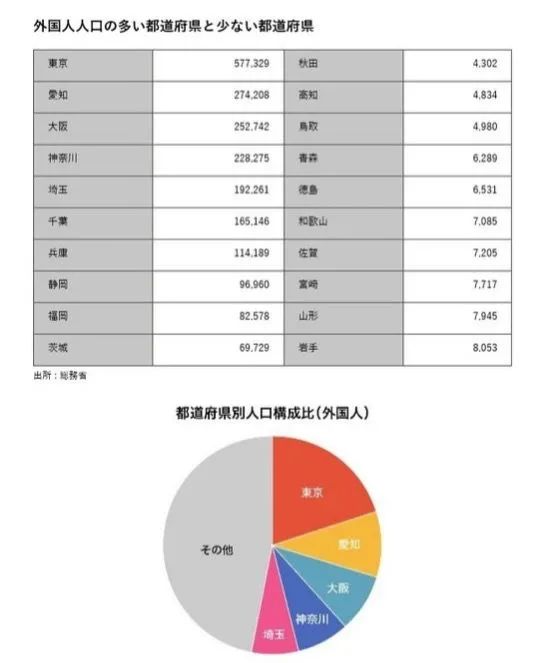 外國人人口的53%集中在東京都、愛知縣、大阪府、神奈川縣、埼玉縣這五個都道府縣。