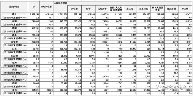 在下表中,讓我們解讀數據以了解居住在日本的外國人的在留資格和居住身份。以下有幾個關鍵的要點:在官方數據中,居住在日本的“外國人”的絕大多數人具有永久或長期居留身份,其中六成外國人是以下五大類:永住者丶特別永住者丶定住者丶家族滯在丶日本人的配偶者。“永住者”(eijyuusha丶えいじゅうしゃ)日本的永久居民(759,139人,占總數的28.8%)。擁有永住者資格(永住權)的外國人可以永久住在日本,在日本可以從事的活動(例如工作)與日本人相同丶不受簽證種類限制丶在留期間不需更新。因此可以更容易地申請日本銀行的貸款。“特別永住者“(tokubetsueijūsha丶とくべつえいじゅうしゃ)特別永久居民(326,190人,占總數的12.4%)。主要對象大多為在日朝鮮人?在日韓國人?在日臺灣人以及其子孫。歷史可以追朔到第二次世界大戰,來自日本殖民統治的殖民地(韓國或臺灣)的人民在當時雖然被視同日本國民并享有日本國籍,但隨著日本戰敗後,來自上述前殖民地的人民以及其子孫失去了日本國籍,為了使這些已定居在日本的人民得以繼續住在日本,給予其特別永住者身份。“定住者”(teijyuusha丶ていじゅうしゃ)長期居民(185,907人,占總數的7.0%)。主要對象為日系人(在日本以外國家有永久居民身份的日本人)及其配偶丶印尼難民丶喪失日本人或特別永住者配偶的外國人丶日本人的外國籍未婚子女等。與永住者一樣不受在日本可以從事的活動(例如工作)與日本人相同丶不受簽證種類限制。但是在留期間必須更新,大多為一年或三年。約五分之一的外國人在日本念書或實習。留學生(在留資格為“留學”)共324,245人,占總數的12.3%。實習生(在留資格為“技能實習”)人共285,776人,占總數的10.8%。這兩個類別共占日本外國人總數的五分之一。在日本工作的外國人最多的在留資格是(按在留資格的百分比計算)是“技術?人文知識?國際業務“。持有此類的在留資格者被定義為“具備法學丶經濟學丶社會學或其他人文科學領域相關知識,并從事與上述知識相關領域的活動或工作”。從事這些活動必須基於與日本公家機關或民間企業之間的工作合約,包括:例如:口譯丶翻譯丶企劃文案丶時裝設計丶室內設計丶銷售丶海外業務,資訊處理丶國際金融丶設計或公共關系以及廣告等。值得注意的是,為了緩減日本人才不足的情況和吸引更多擁有高度專門技能人材,日本政府新增設了以下三類在留資格:2015年新增“高度專門職”(高度人才簽證)丶2017年新增“介護”以及“技能實習3號イ?ロ”。因此,此三類在留資格於2018年6月末對照2017年年末,有超過20%的大幅增長率。此三項在留資格的在留期間最長可達到5年。其中,“高度專門職”(高度人才簽證)由於「學歷」丶「職務經歷」丶「年収」累積積分達70分即可申請,并且可享較多的優惠制度(例如:工作累積1年或3年即可申請成為永住者),因此許多原本持“技術?人文知識?國際業務“的外國人也在此在留資格實施後陸續變更在留資格。