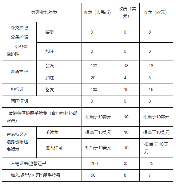 注:上述費(fèi)用除香港特區(qū)護(hù)照申請(qǐng)和入境身份陳述書(shū)以美元為標(biāo)準(zhǔn)外,其余均以人民幣為標(biāo)準(zhǔn)換算成等量當(dāng)?shù)刎泿拧?/p>