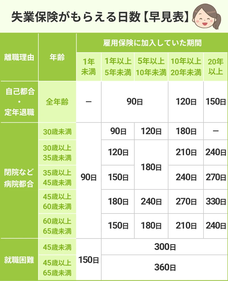 具體的規定支付天數在90天~360天之內,由離職時的年齡、加入雇傭保險的期間、離職理由等決定。