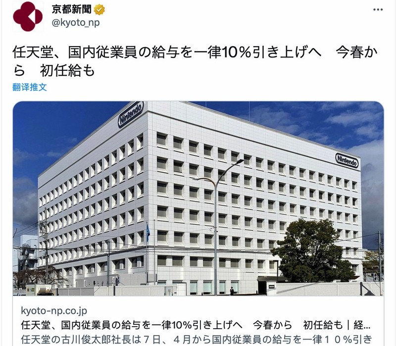 任天堂社長古川俊太郎宣布,為了應(yīng)對物價(jià)上漲等宏觀環(huán)境變化,將今年春季為所有日本員工漲薪10%,4月入職的新員工也同樣增加10%,起薪從23.3萬日元漲至25.6萬日元。