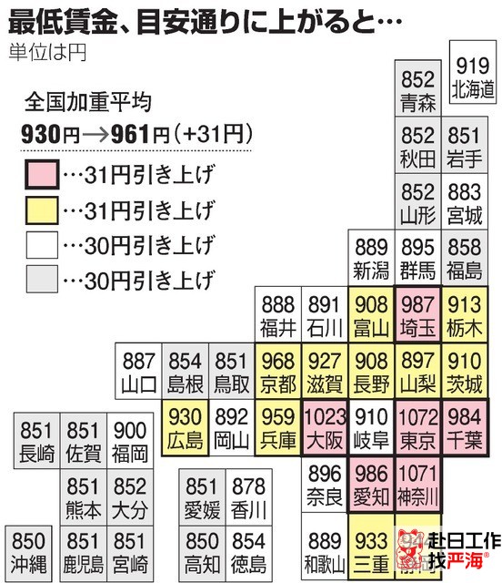 全國平均最低小時工資961日元。(比去年的全國平均930日元,增加了31日元)