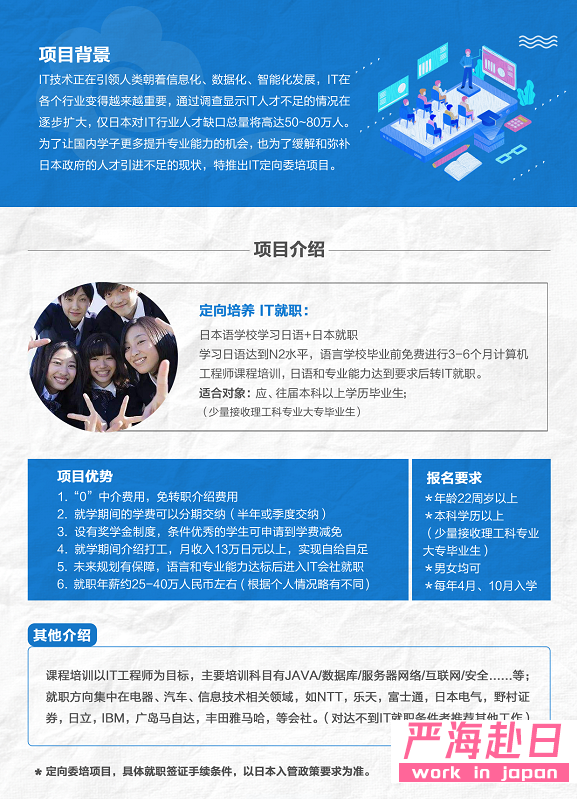 日本語學校學習日語+日本就職學習日語達到N2水平,語言學校畢業前免費進行3-6個月計算機工程師課程培訓,日語和專業能力達到要求后轉就職。適合對象:應、往屆本科以上學歷畢業生;(少量接收理工科專業大專畢業生)