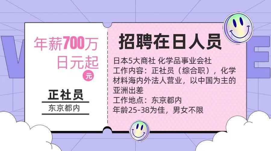 年薪700w日元起公司:日本5大商社 化學(xué)品事業(yè)公司(母公司全資子公司)工作內(nèi)容:正社員(綜合職),化學(xué)材料海內(nèi)外法人營業(yè),以中國為主的亞洲出差工作地點(diǎn)&待遇:東京都內(nèi),初年年收700萬起,應(yīng)商談要求:有制造業(yè)或商社的營業(yè),25-38為佳,男女不限